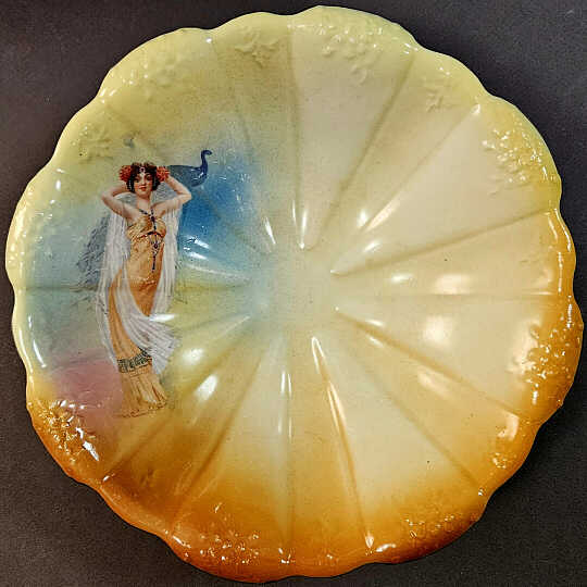 Left: "Currant" on an Angelus 6" plate, right: Colonial couple on an Alaskan ice cream plate |