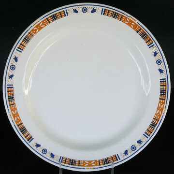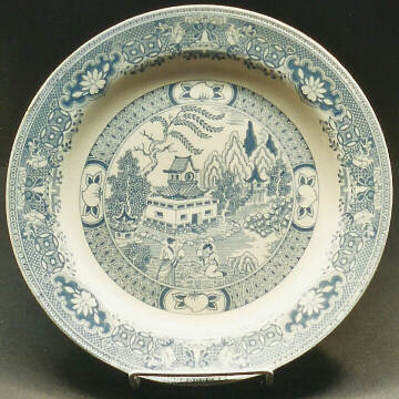 The Brittany shape was developed in November 1935 and introduced in 1936. It was designed as a plain round rim shape so it could be decorated with silk screen patterns. Such patterns were applied to bisque ware and then were given a clear glaze. The silk screen patterns were either monochromatic or in two-color combinations. The same screen could be used with different colors to produce multiple patterns. For example, Constellation, a.k.a. North Star, was made in five different colors: red (often called pink), blue, green, black, and gray. A few of the initial Brittany patterns also used gold stamps, namely Empire.