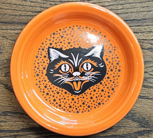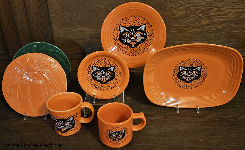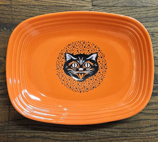 Black Cat on poppy with pumpkin plates in poppy and jade |