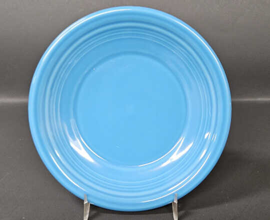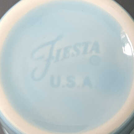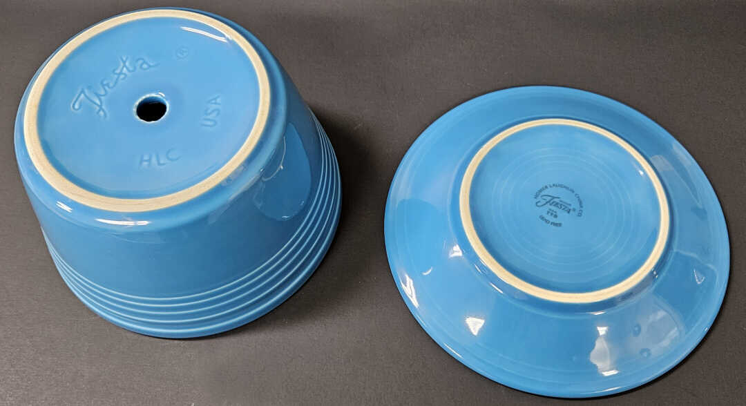 The pot has a drain hole with debossed marking. Unlike Fiesta plates, the liner doesn't have rings in the center. It can be found with an underglaze backstamp.