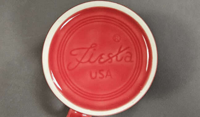 Initially, tapered mugs were given an underglaze backstamp. A debossed Fiesta® HLC-USA marking was added in September 2018. The marking was changed again in March 2024 with a new logo.