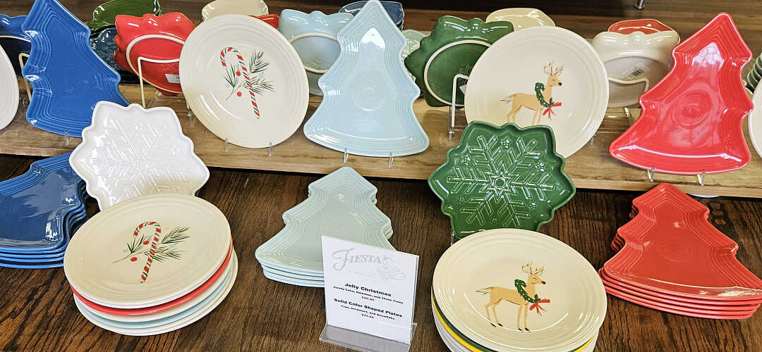 Tree plates and other Christmas pieces for sale at the outlet in Newell, WV. November 2025 |