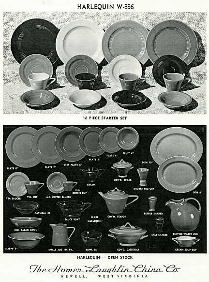 Harlequin was made by the Homer Laughlin China Company from 1936 until 1964 in twelve colors. It was an inexpensive alternative to Fiesta and primarily sold through F. W. Woolworth five and dime stores. Homer Laughlin made many dinnerware lines made for Woolworth which were given a treatment number with a "W-" prefix. Harlequin's was W-336.
