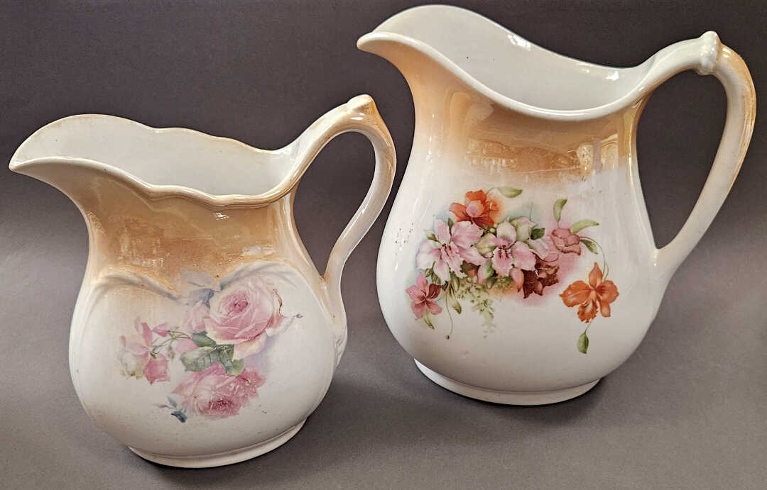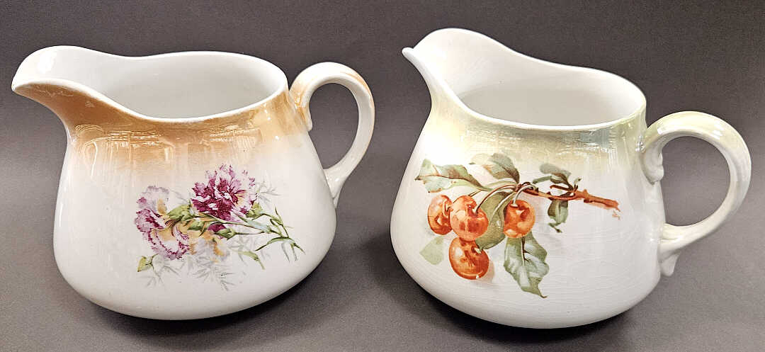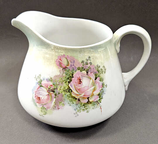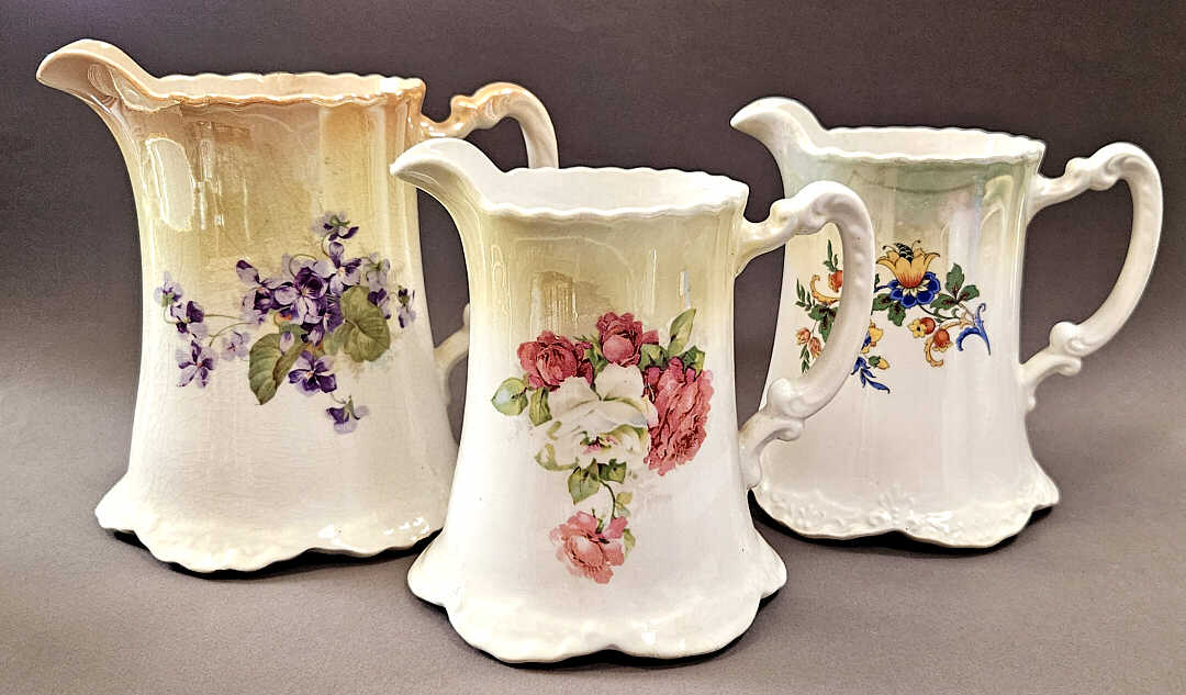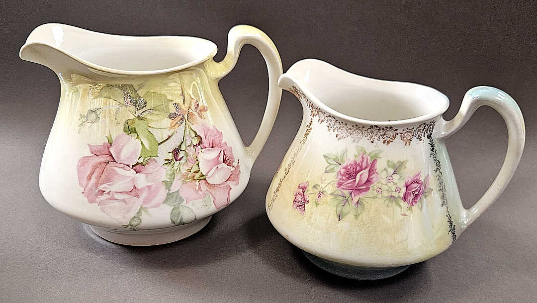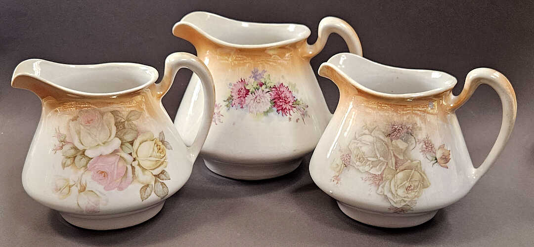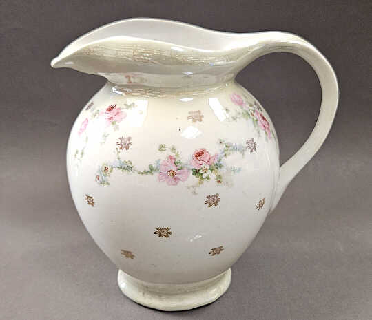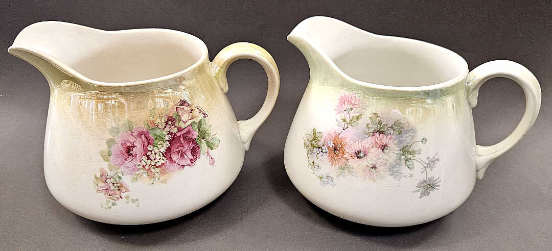 From 1910 until the very early 1930s, the Homer Laughlin China Company made specialty jugs with lustre sprays and oversized decals. Most lustres were applied towards the tops of the jugs. They were either single color, or a combination of two colors. The decals were never meant for regular dinnerware. Their larger sizes were perfect to decorate medium size jugs, as wells as platters and serving/salad bowls.