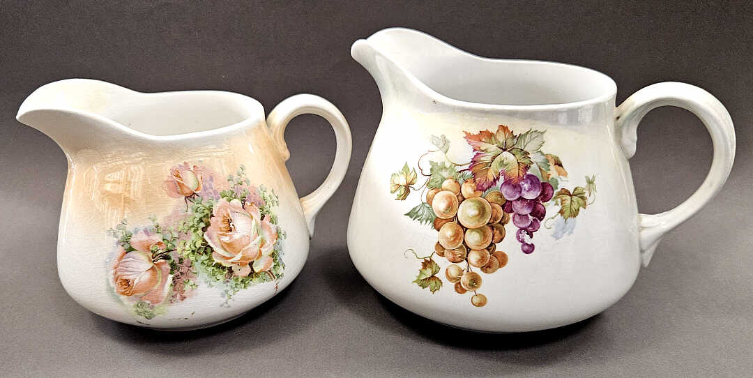 The combinations of lusters and large decals were used on second and third quality ware. When a jug, platter, or other serving pieces had imperfections, it wasn't used in a standard dinnerware line. Instead, it could be decorated with the lustre-decal combo and turned into a sellable piece of ware. Small grocery stores, hardware stores, wholesalers, and retailers could purchase the specialty pieces and sell them as stand-alone items, usually at a discount.