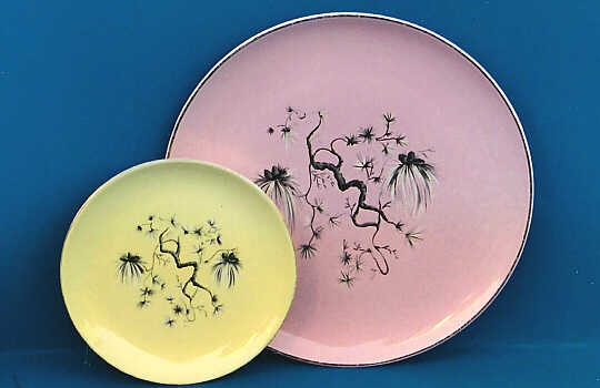 Besides the solid color line, Pebbleford, Versatile was also made in pastel glazes - with and without decals, and in white with decals and underglaze decorations. Several Versatile patterns made use of special "fade away" or wash trims along the rim.