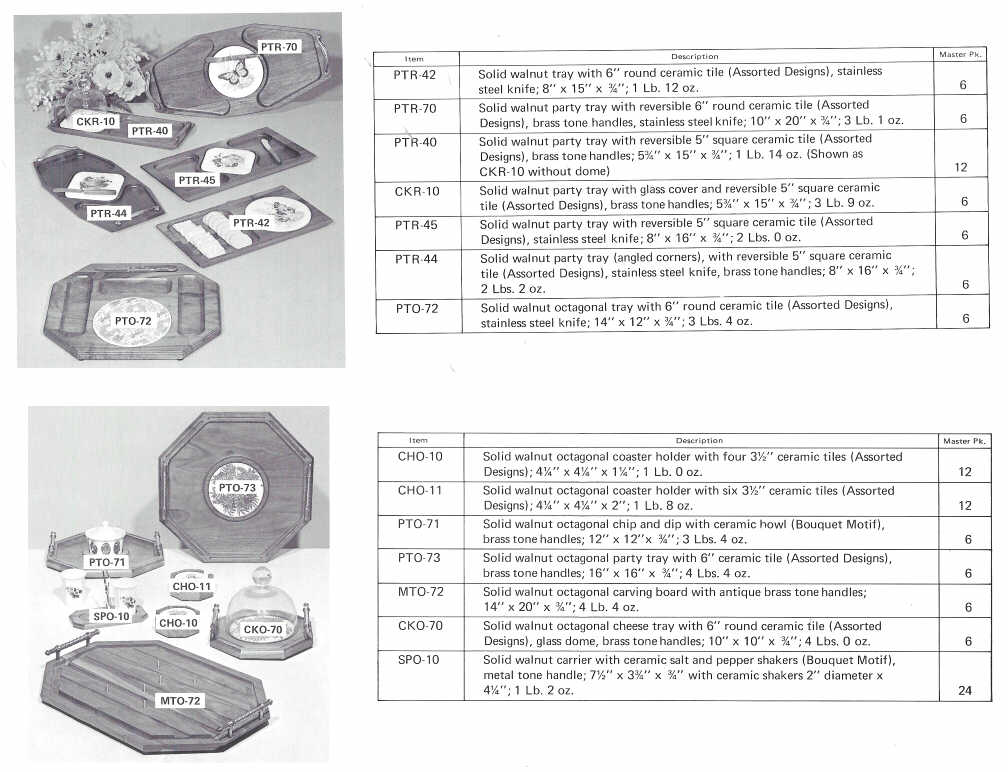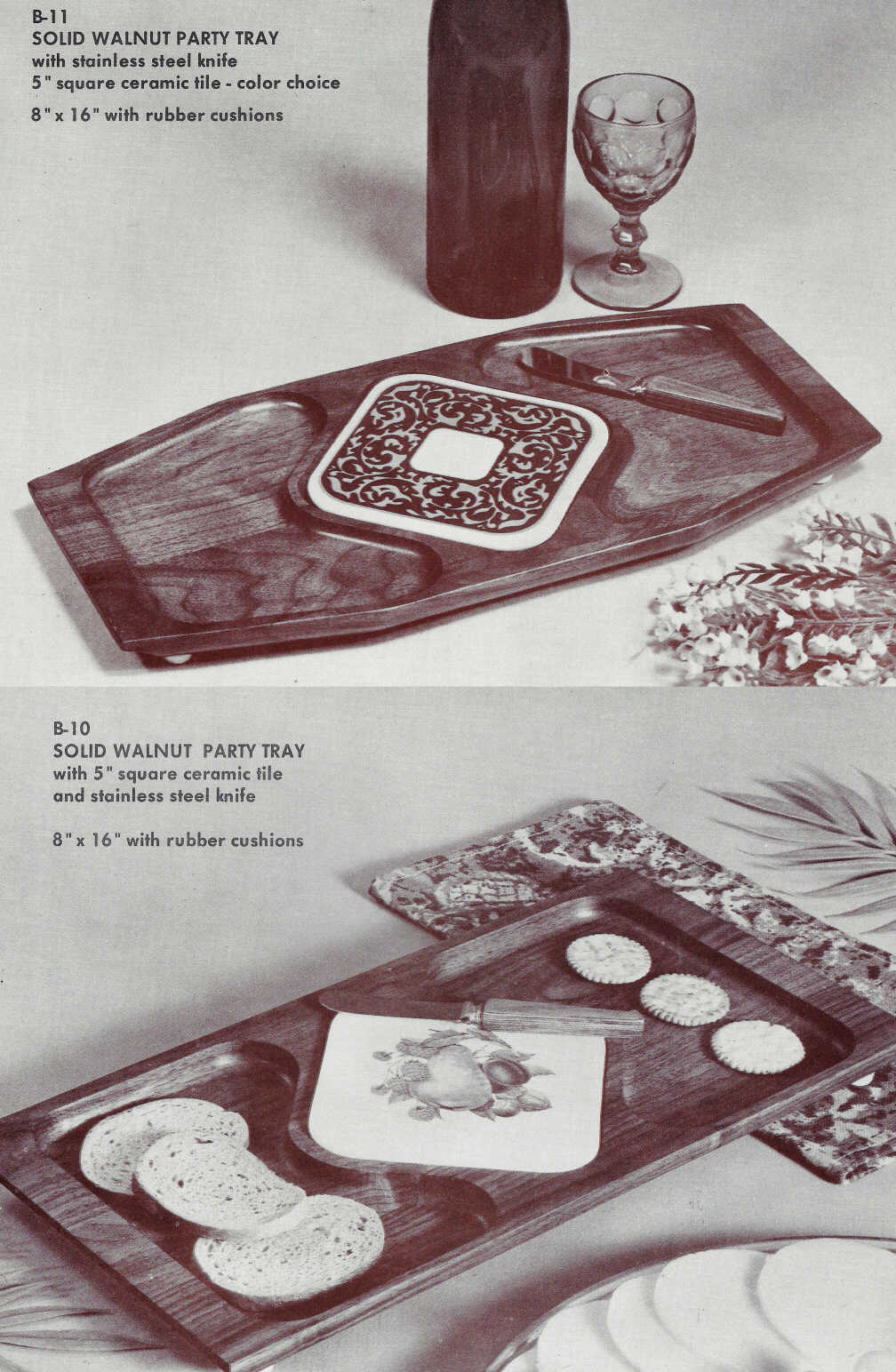 After a source for walnut was found, TS&T started to create cheese trays, cutting boards, serving trays, and decorative accessories including candlestick holders. Dark walnut was almost always the wood of choice, but in some cases (namely the cutting boards) maple was also used. Many of the early pieces were designed by John Gilkes who also created most of TS&T dinnerware shapes starting in 1953. Almost every piece of Timber Craft was marked with a Timber Craft sticker or impressed mark.