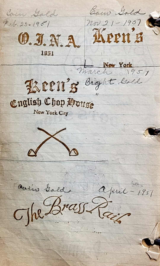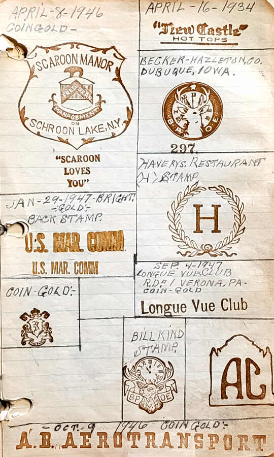 The images below come from a Hall China Company gold stamp record book. It shows many of the stamps used, some of which are dated from the 1930s to the 1960s. Besides stamps used in markings and on teapots and lamps, there are many designs made for specific clubs, hotels, businesses, organizations, taverns, and railways.