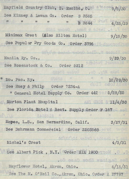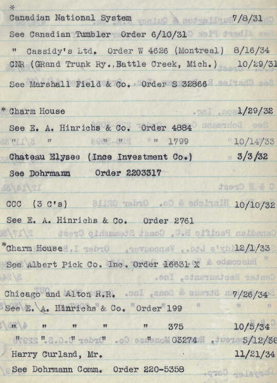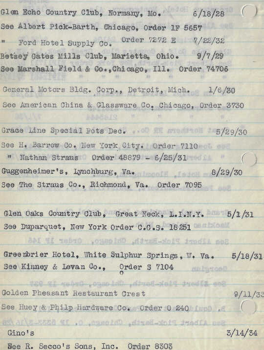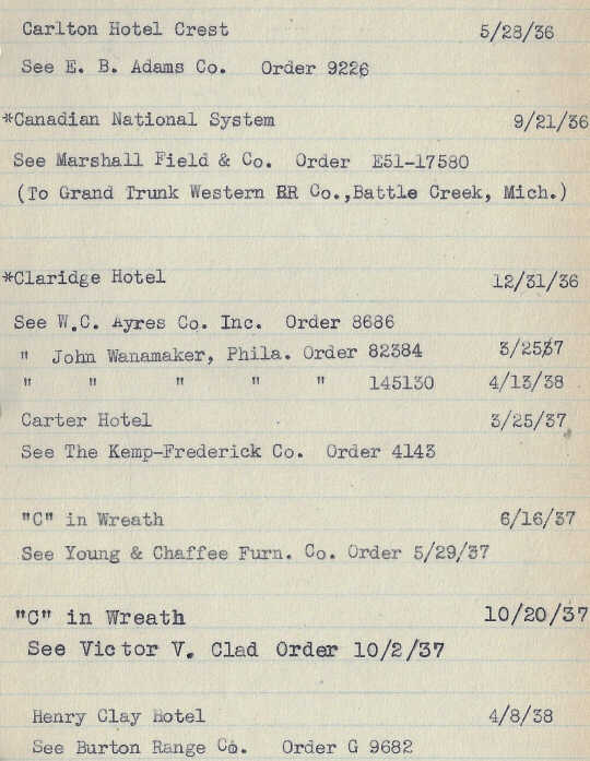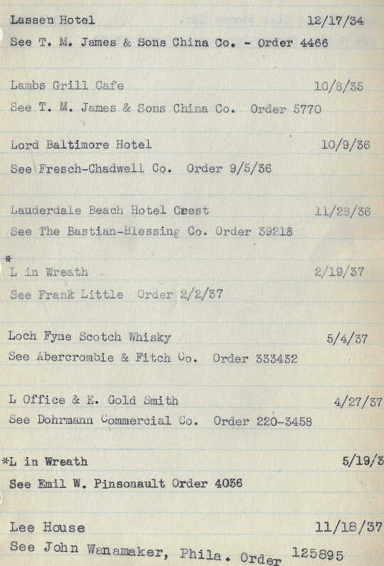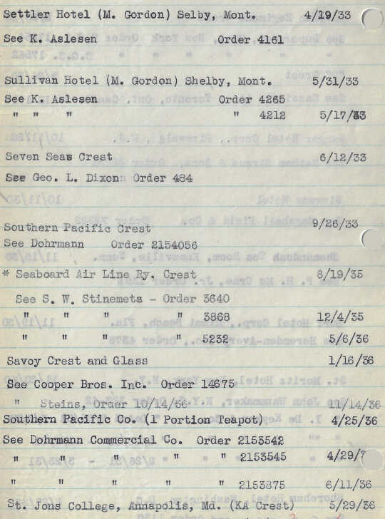 Below are Hall China order records for crest logos used by hotels, restaurants, country clubs, yacht clubs, tea rooms, railroad companies, stores, schools, and other institutions from 1928 to 1938.