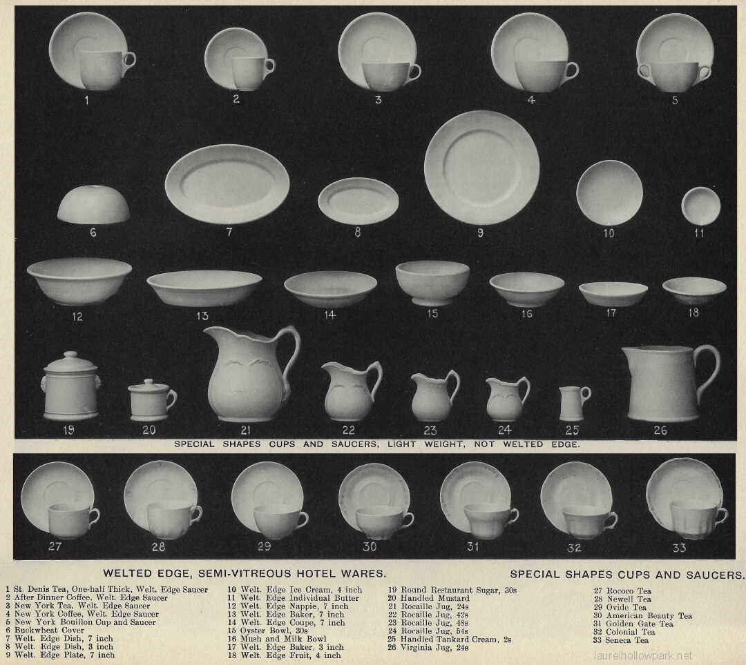 Below is the 1914 Homer Laughlin catalog. Featured are HLC's dinnerware shapes; Hudson, Empress, and The Angelus . White Granite Staples, Hotel Ware, and Toilet Ware are also included. Interestingly, Genesee was not included even though patterns were still offered in the pricing scale catalogs of 1914, 1915, and 1916.