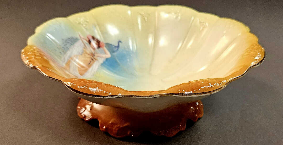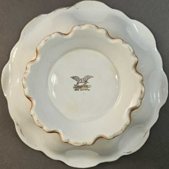 The Homer Laughlin China Company started their line of Art China in 1902 under the direction of Arthur Mountford. The special "Laughlin Art China" gold marking was applied over the glaze and wasn't always used. It appears mainly on Currant, White Pets, Monks, Gypsy, Juno, Laughlin Blue, Ruby, as well as several other patterns. On the other hand, treatments such as Holland, Cardinal, Caledon, and Silver Sienna generally weren't given the special Laughlin Art China gold marking. Just because a piece doesn't have a Laughlin Art China marking doesn't automatically mean it isn't art china.