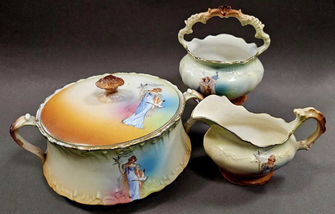 Juno pattern on Tioga sugar basket, Tioga creamer, and biscuit jar |