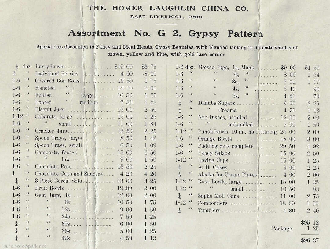The following are more of Homer Laughlin's small and large specialties shapes, many of which can be seen in the 1907 catalog. Also included are listings from four different treatments; Gypsy, Floral decorations, Chester Rose, and Dresden.