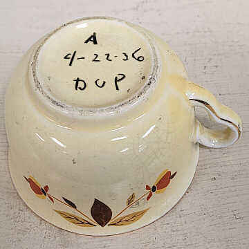 Three pieces were created at Homer Laughlin in August 1934. Each was made with with Hall's rayed embossing: the 9" plate, teacup, and saucer. Company records indicate the plate and saucer had three "panels" and the teacup had four. Unfortunately, the line wasn't expanded and Homer Laughlin didn't not make Autumn Leaf dinnerware. Instead, Hall China started making semi-vitreous wares and got the order. They would go on to make several different dinnerware lines besides Autumn Leaf such as Red Poppy, Orange Poppy, Silhouette, Crocus, and many others. Jewel Tea stopped offering Autumn Leaf in 1976.