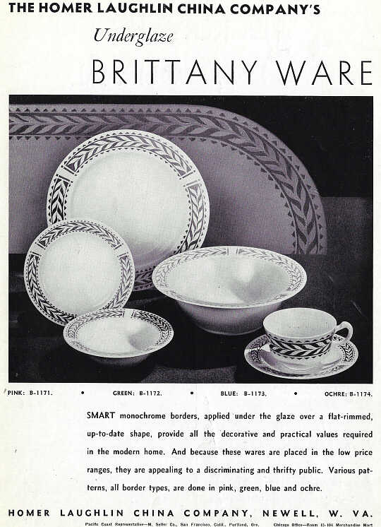 Brittany was often mixed in with other Homer Laughlin shapes. The flatware was paired with Charm House hollowware in the Applique lines. There are several decal lines from the 1950s that mix Brittany flatware with Cavalier hollowware. The Brittany rim soup, demitasse cup, and demitasse saucer were picked up and used as needed in solid color Rhythm dinnerware. In the late 1950s, the Brittany teapot and sauceboat were often used with Studio hollowware in later Dura-Print patterns. During the 1960s, Brittany flatware was used with Orbit hollowware to create several patterns.
