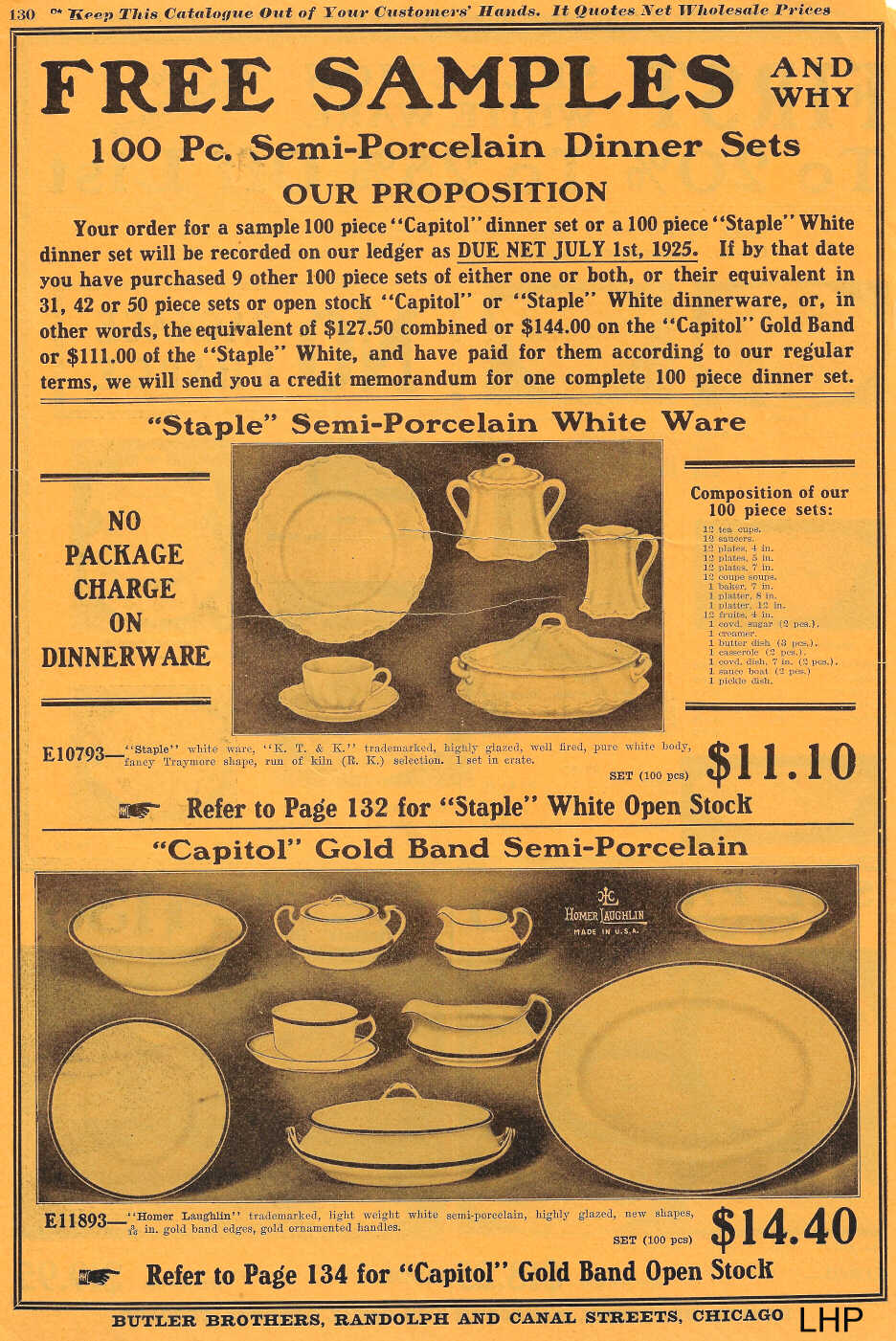 The following pages come from a 1925 Butler Brothers catalog. In this issue they offered wares made by the Homer Laughlin China Company and several others from the upper Ohio Valley region including Edwin M. Knowles, National China, and Knowles, Taylor & Knowles. The following dinnerware lines are featured: