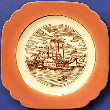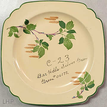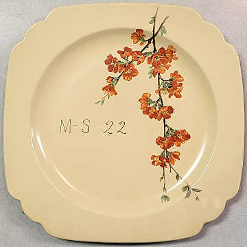 Century is rather easy to find. It was a major HLC decal shape from its introduction in 1931 until it was phased out around the late 1940s. Some items were discontinued early such as the round covered butter, demitasse cup and saucer, 36s bowl, cream soup and liner, and gravy fast stand. These have become key pieces for Century collectors and when found in ivory with no decoration, they become very desirable to Riviera collectors. Century is usually marked with the multicolored Wells peacock mark or a general backstamp The square shape received just about every type of decoration available at the time such as decals, platinum and gold stamps, silk screen, and solid colors.