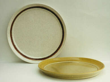 Shown to the right on the Challenger shape is the treatment, "Earth" -- a white speckeld glaze with a single brown stripe on the flatware. This line was available in S&H Green Stamps catalogs in the late 1970s.