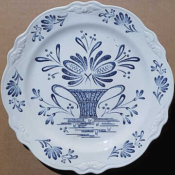 In the early 1960s, Homer Laughlin crated Sheffield Imperial Blue Dresden, or simply, Dresden. It was a special line of dinnerware based on the Virginia Rose shape. Many of the standard items were used such as plates, platters, teacups, the sugar, and the creamer. Bowls and saucers were restyled, and several new items were added to complete the line. They were given an underglaze blue onion design and were generally unmarked except for the larger plates.
