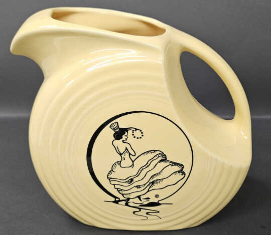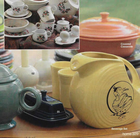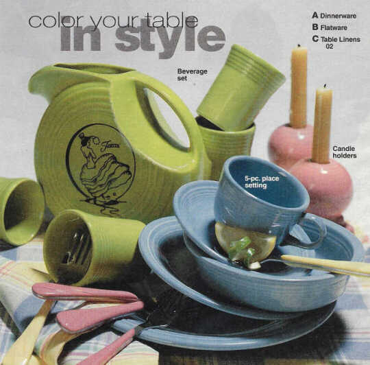 The dancing lady beverage set with a disc pitcher in yellow with the dancing lady decal and four tumblers in yellow was an exclusive for J.C. Penney. It first appeared in their Fall/Winter 1997 catalog as a new item.