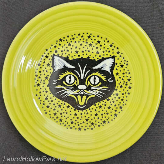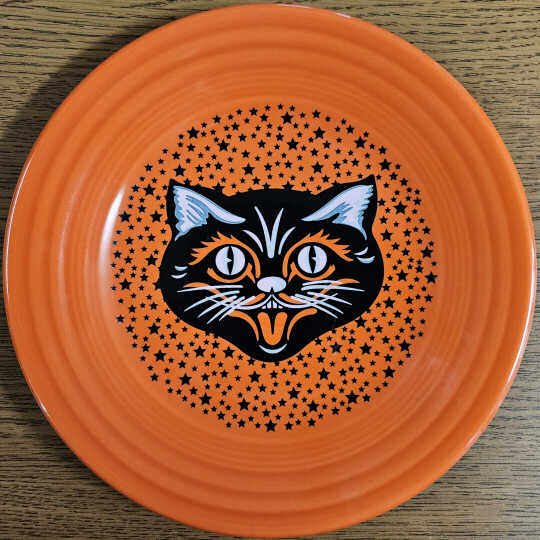 Black Cat on poppy with pumpkin plates in poppy and jade |