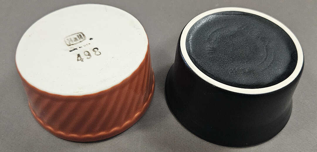 From 1997 to 2019, the factory dipped several of their restaurant ware shapes in Fiesta® glazes for their Fiesta® Mates and Colorations lines. Below are a few examples of ramekins and bouillons, along with some from the Hall China Company.