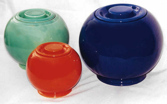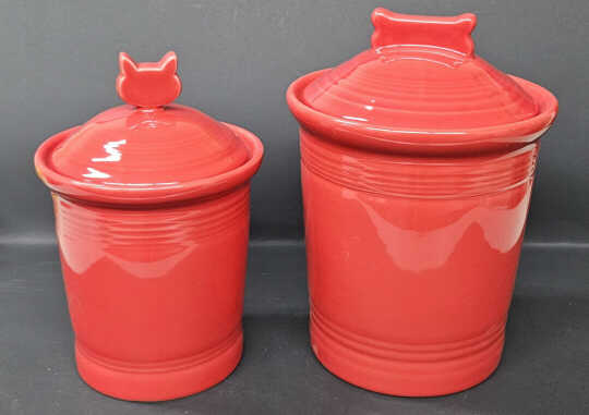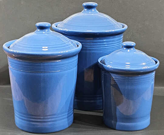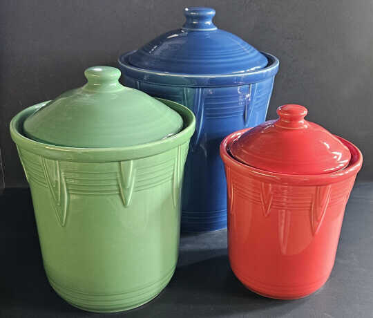 In the vintage Fiesta® Kitchen Kraft line made from 1938 until the early 1940s, there were three sizes of round covered jars made in red, blue, green, and yellow.