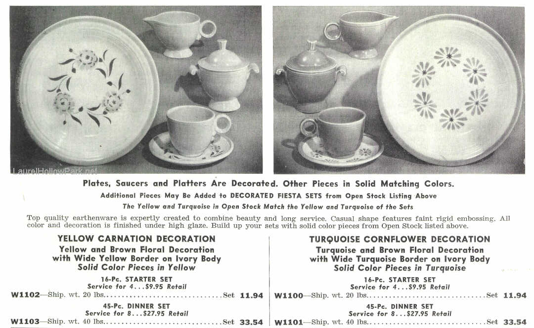 Finally, Fiesta® flatware was decorated with stencil patterns and mixed with solid color hollowware. Only two patterns went into production, F-107, Carnation with yellow Fiesta®, and F-108, Cornflower, also known as Hawaiian 12-Point Daisy, with turquoise Fiesta®. A third one, Sunflower using medium green Fiesta®, was planned, but it did not go into production. Carnation and Cornflower were sold under the name Fiesta® Casual.