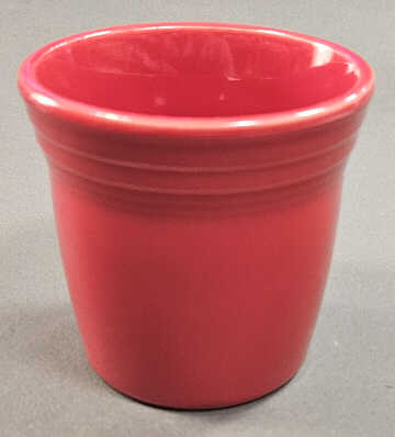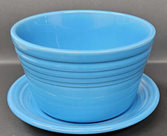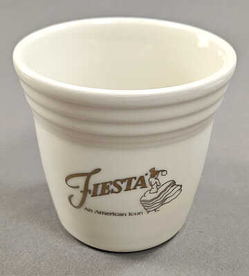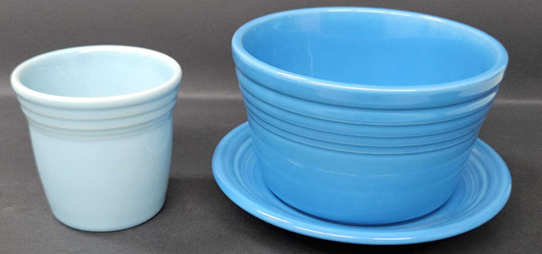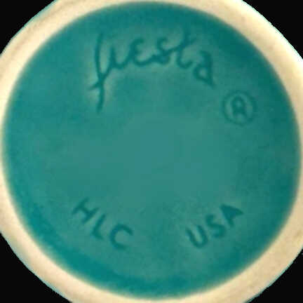 The pot has a drain hole with debossed marking. Unlike Fiesta plates, the liner doesn't have rings in the center. It can be found with an underglaze backstamp.
