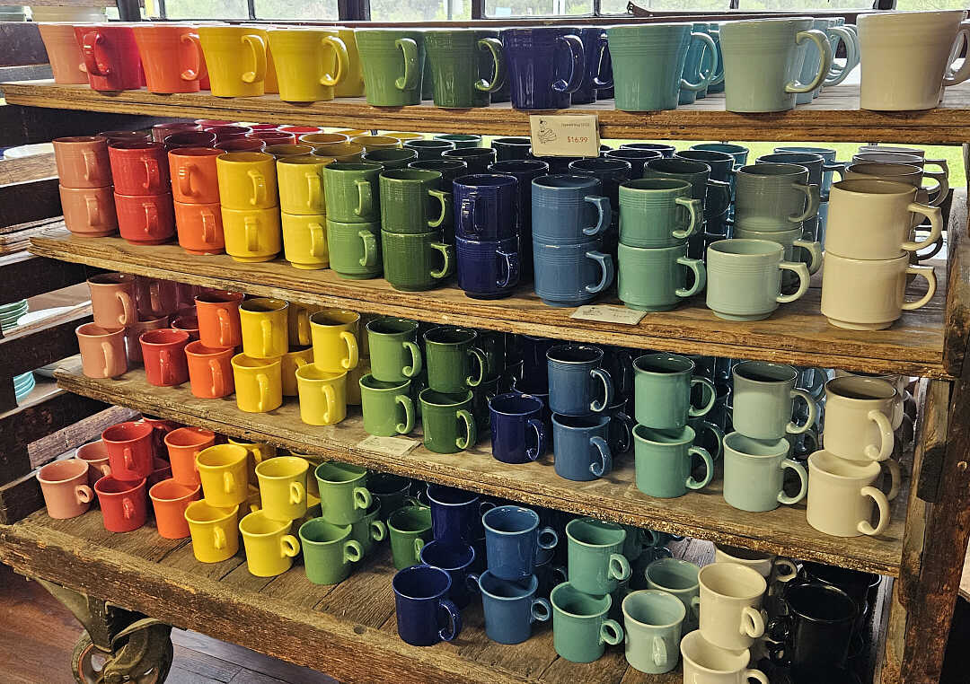 Fiesta® tapered, stacking, java, and classic ring handle mugs at the factory outlet, April 2025