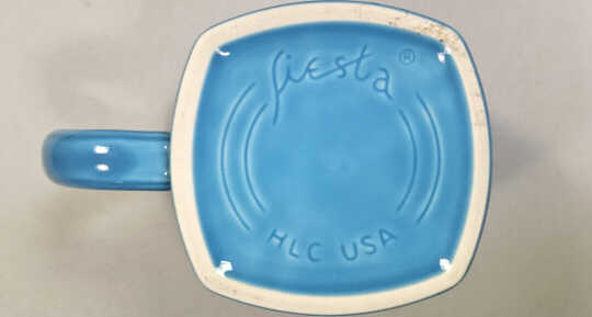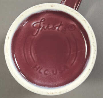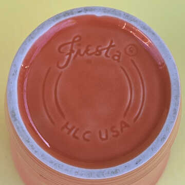Initially, tapered mugs were given an underglaze backstamp. A debossed Fiesta® HLC-USA marking was added in September 2018. The marking was changed again in March 2024 with a new logo.