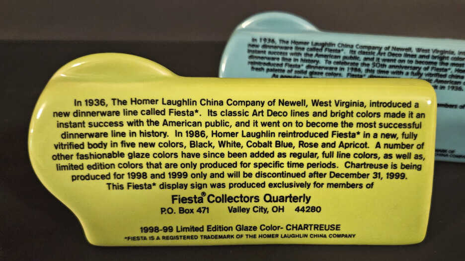 The shelf sign (item number 0752) was made for China Specialties and was offered to members of the Fiesta® Collector's Quarterly.
