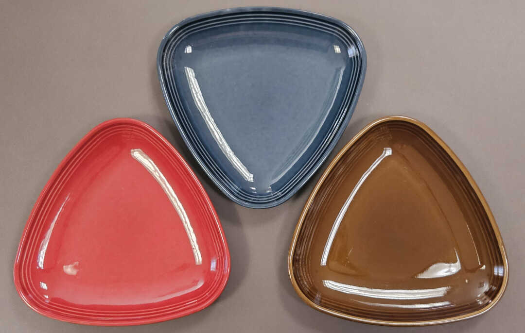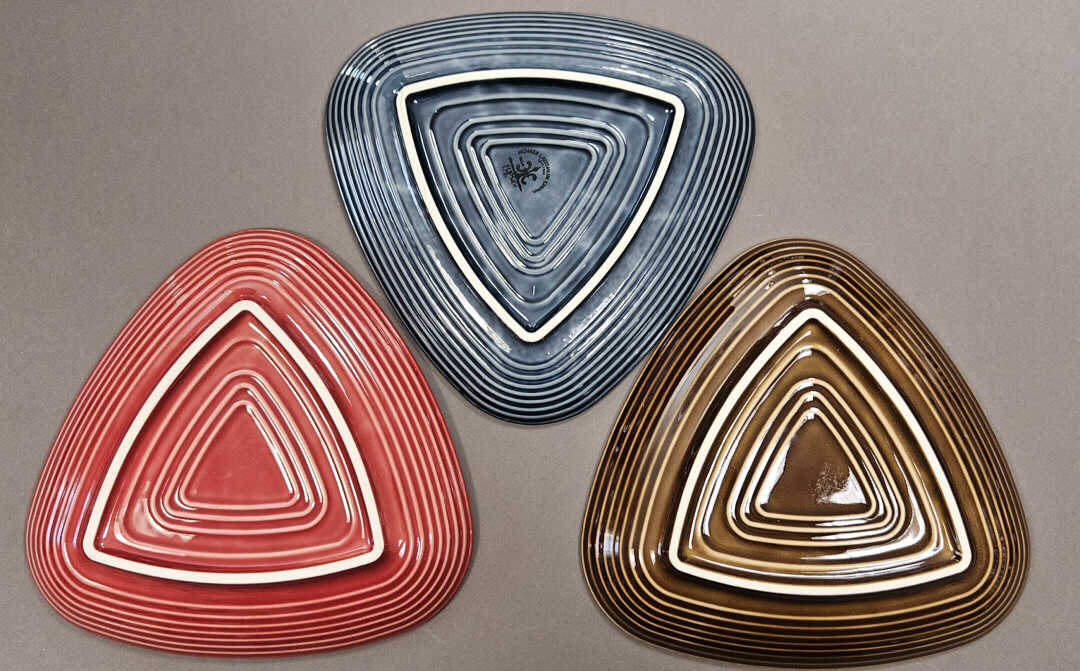 Flipside triangle plates in the Bosque glazes: chestnut, blueberry, and maple |