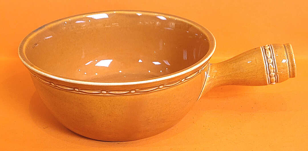 Each piece has the familiar Georgian type dot-dash rim embossing also found on Georgian/Crafstman dinnerware. Most pieces were marked with a generic HLC backstamp or an OvenServe marking, but some can be found with a special "Georgian Dinnerware" stamp in gold.