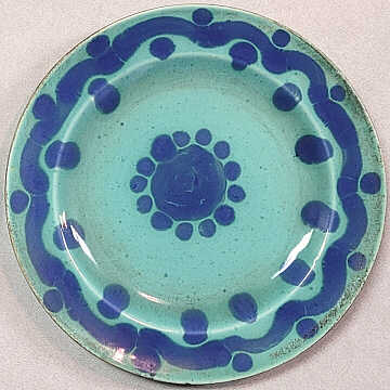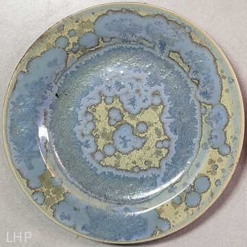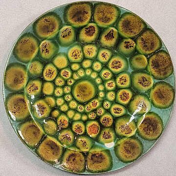 The second batch of images show hand-painted work and various glaze-on-glaze techniques. These were also done using Wells 6" plates, but given the base colors, they were probably made a few years after the crystalline glaze samples. They were glazed both front and back and have identification numbers as well.
