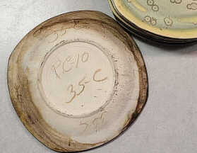 The first batch is of crystalline glazes. The sticker in the first photo below was initialed by Rhead, Frederick Hurten Rhead. The plates were made by placing zinc and other elements in the kiln that would react with the glazes during firing. This process resulted in glaze effects of varying degrees. (It should be noted the Wells Art Glazes were also made using a crystalline process, namely Burnt Sienna (rust) and Leaf Green, however, those particular reactive glazes are not nearly as dramatic as the ones shown below.) None of the test plates were glazed on the reverse which allowed for identification numbers to be penciled in. To the right is a picture of the back of a Jade shape plate with its numbers.