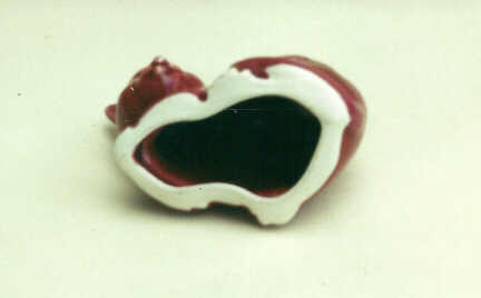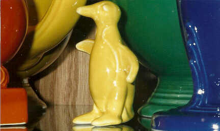The duck seems to be a copy from a set of three ducks made by another pottery in a pale green glaze with cold paint accents. The lamb looks very much like a scaled down version of a McCoy vase. In fact, all six animals may very well be copies or modified versions made by other potteries. One thing is certain, other companies had access to the same molds and produced animals that are almost identical in weight and size. The donkey and duck shown below are two such animals. They are identical in very way to HLC's versions except they are done in white. Most of the time they are found with gold accents. Authors Sharon and Bob Huxford have coined these as "Mavericks."