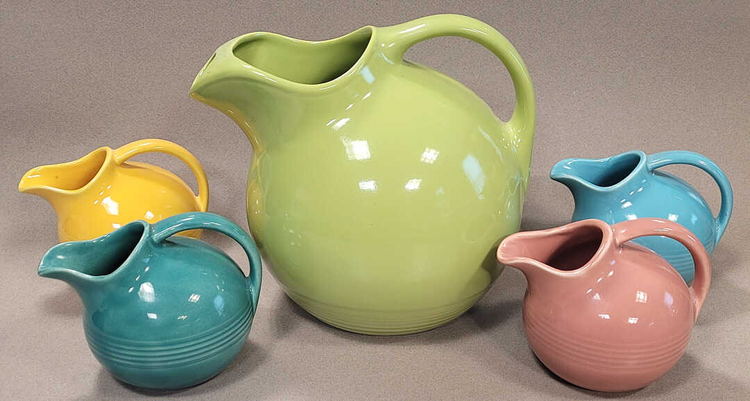 In 1959, the color line up changed for the last time when rose, gray, forest green, and chartreuse were dropped. Harlequin yellow and turquoise continued production along with a new green glaze, called "medium green" by collectors. Fiesta red was reintroduced at this time. More pieces were discontinued when this color changed occurred and are hard to find in medium green: the service water jug, 22-oz jug, and novelty creamer to name a few.