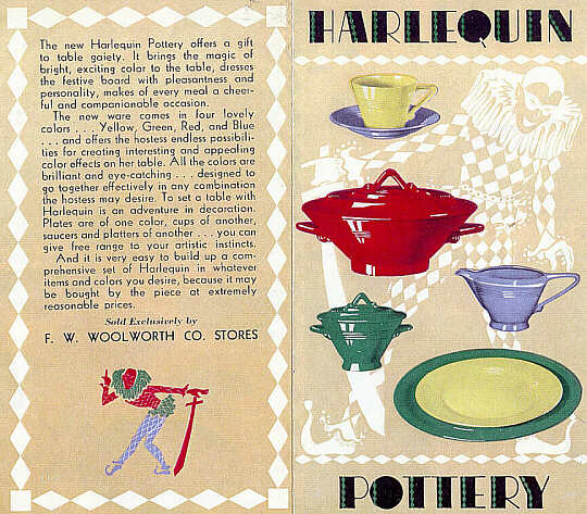 Harlequin was made by the Homer Laughlin China Company from 1936 until 1964 in twelve colors. It was an inexpensive alternative to Fiesta and primarily sold through F. W. Woolworth five and dime stores. Homer Laughlin made many dinnerware lines made for Woolworth which were given a treatment number with a "W-" prefix. Harlequin's was W-336.
