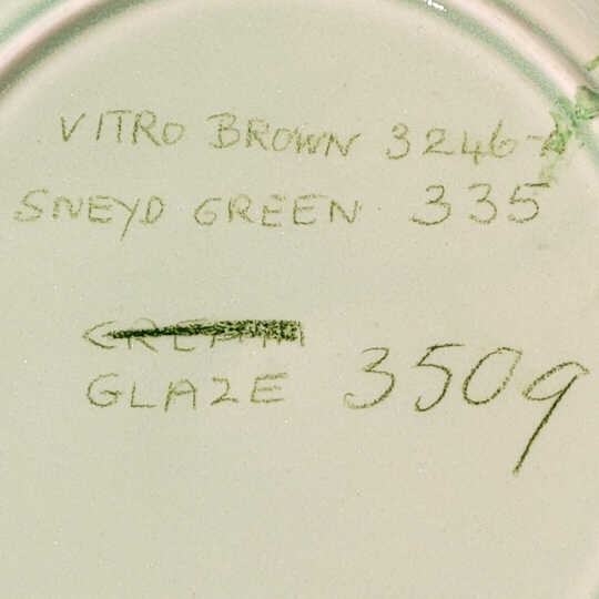 Interestingly, the base colors were not standard Harlequin glazes. The first three were done in 5309 green, the next two in 3515 yellow, and the last two in 5308 fawn.