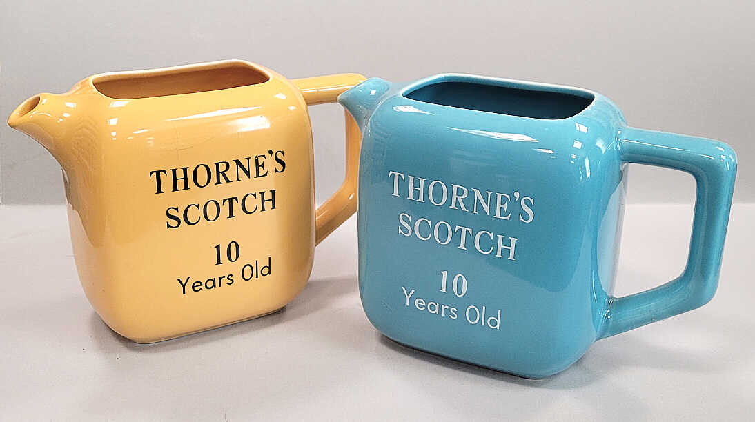 In 1967, another water jug decoration was added to the line. It was given the treatment number HW-6 with the specification that the jugs were to be glazed in Fiesta yellow with "Throne's Scotch 10 Years Old" decals. By the summer of 1969, another Thorne's Scotch jug was added. This time it was glazed in Fiesta turquoise and designated HW-8.