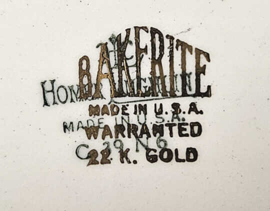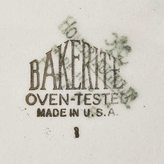 Examples with both marks have been found with HLC date codes from the late 1930s to the late 1940s. The HLC-Harker pieces are a bit of a mystery. It is most likely Harker decorated Homer Laughlin blanks since the Bakerite stamp is placed over the HLC marking. Had Homer Laughlin decorated these pieces at their factory for Harker, then they probably would have used unmarked examples.
