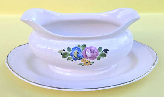 In any case, at least four Harker decorations have been found: Red Apple, a.k.a. Orchard, Modern Tulip, Petit Point, and Sweetheart Rose. All four of these treatments were used extensively by Harker Pottery.