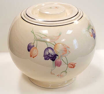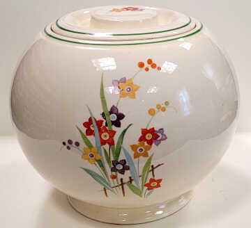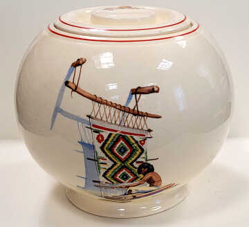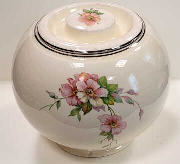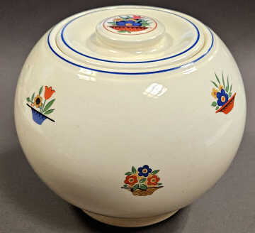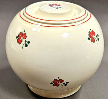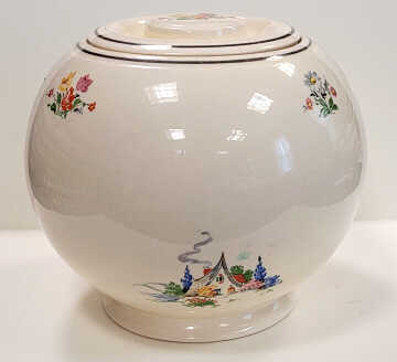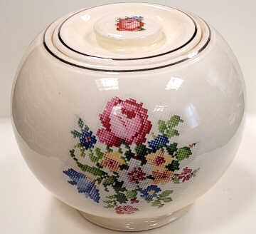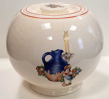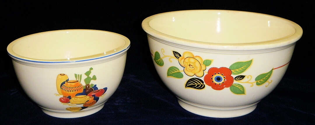All of the standard Kitchen Kraft items were released into production by the end of June 1937. There was one revision in July when the covered jug was made smaller and is listed in trade size form as a 24s jug. The shapes are rather plain with only a double band decoration at the rim. Unlike embossed OvenServe, Kitchen Kraft doesn't have any dinnerware shapes such as plates, teacups, and saucers. Instead, Kitchen Kraft wad designed to supplement other dinnerware shapes since it is found with decals and solid colors used primarily with dinnerware lines. Virginia Rose's VR-128 and JJ-59 are common on Kitchen Kraft. The Mexican theme decals, Mexicana, Conchita, and Sunporch are very popular on Kitchen Kraft.