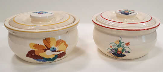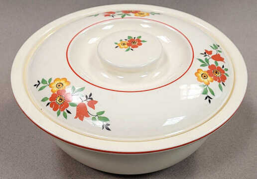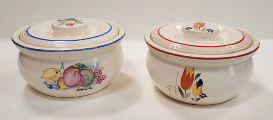 After the success of the embossed oven-to-table line, OvenServe, it was decided to make a plain style which would be better suited to receive decal treatments. On October 6, 1936, designer Frederick Rhead makes the first mention in his journals of what would become known as Kitchen Kraft OvenServe, or simply, Kitchen Kraft : ...making designs for streamline OvenServe casserole for 1937.