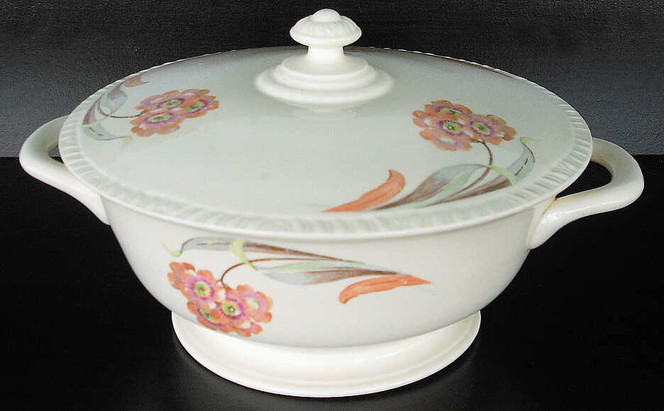 From late March to June, work commenced on creating the various patterns for Liberty. On Monday, June 22, 1942, an entry in Rhead's journals discuss the new treatments: Beale samples out this afternoon. Could be a lot better printing. Most items lack detail and fine tonal variations. Work commenced on improving the quality of the prints, but on July 24, 1942, another change was made - this time with regard to the shape which resulted in a heavier and sharper gadroon edge. In August and September all the existing Liberty shapes were remodeled and a new items was added; the sauceboat.
