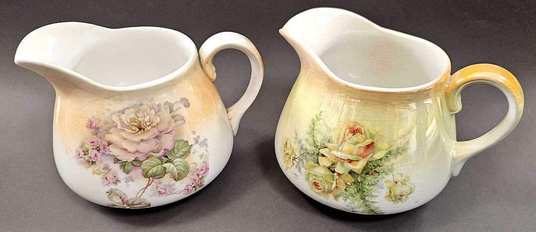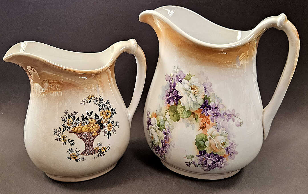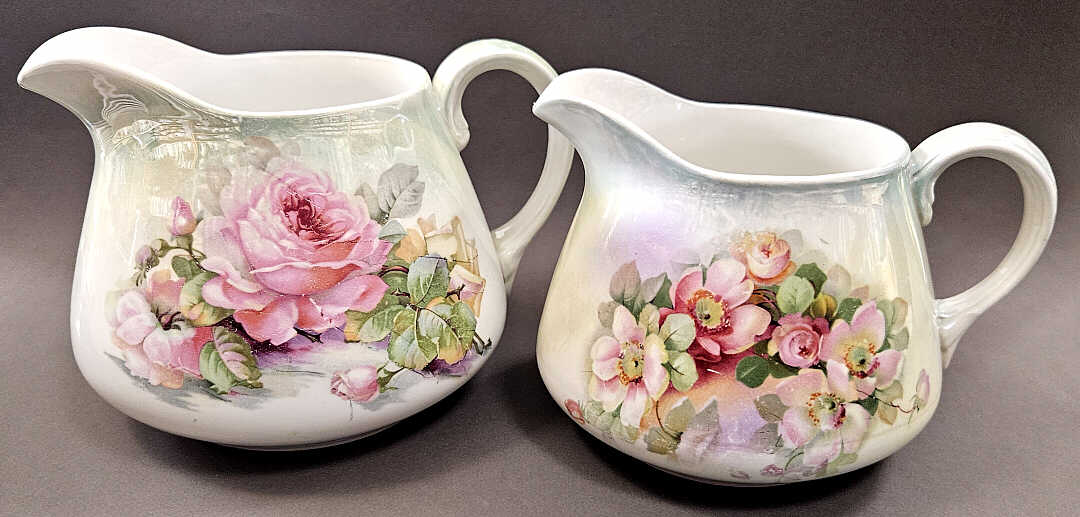 From 1910 until the very early 1930s, the Homer Laughlin China Company made specialty jugs with lustre sprays and oversized decals. Most lustres were applied towards the tops of the jugs. They were either single color, or a combination of two colors. The decals were never meant for regular dinnerware. Their larger sizes were perfect to decorate medium size jugs, as wells as platters and serving/salad bowls.