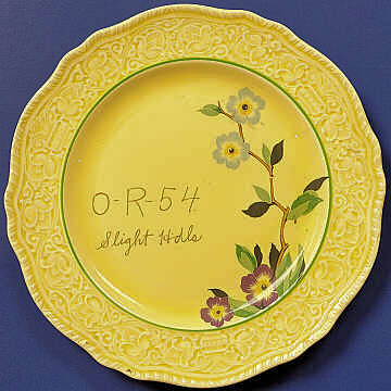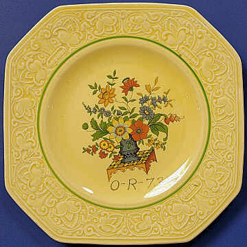 Pieces are marked one of three ways: a simple Old Roman backstamp, a Design Patent number 77912, and the Wells Art Glazes mark. Originally made for Quaker Oats, it wasn't a very extensive line and is one of the more challenging HLC shapes to collect. No larger pieces such as sauceboat, teapot, or casserole have been found and may not exist. Decaled yellow square plates are some of the easier pieces to find. The known pieces are: