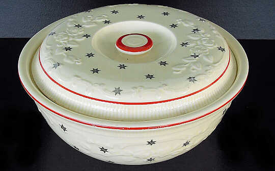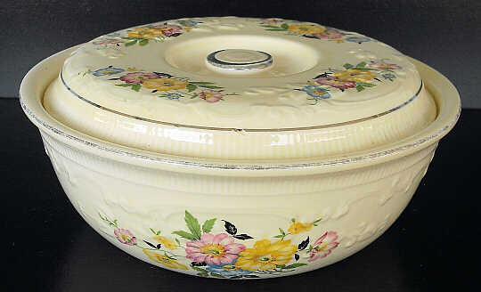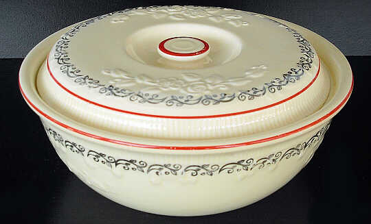 In the early 1930s, most pottery companies stared to produced kitchenware. A brief list of potteries with their special lines include: Paden City - Bak Serve, Harker - Bakerite, Cronin - Bake Oven, and Crooksville - Pantry Ware. In 1933, Homer Laughlin introduced an extensive assortment of embossed kitchenware called, "OvenServe." This line included various sizes of bowls, bakers, platters, as well as some dinnerware pieces; plates, teacups, and saucers.
