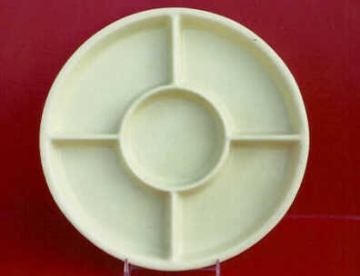 Eventually, OvenServe was made primarily in Orange (a.k.a. pumpkin), Melon Yellow, and Ivory. The ivory glaze developed for this shape would go on to be used with Kitchen Kraft, Virginia Rose, Marigold, and others. At some point, it was decided that the Art Glazes would be used. Casseroles and under plates have been found in leaf green (right), rose, and rust with the Wells Art Glazes backstamp. Small OvenServe pieces in other solid colors were made by both HLC and Taylor, Smith & Taylor (TS&T) for Quaker Oats.